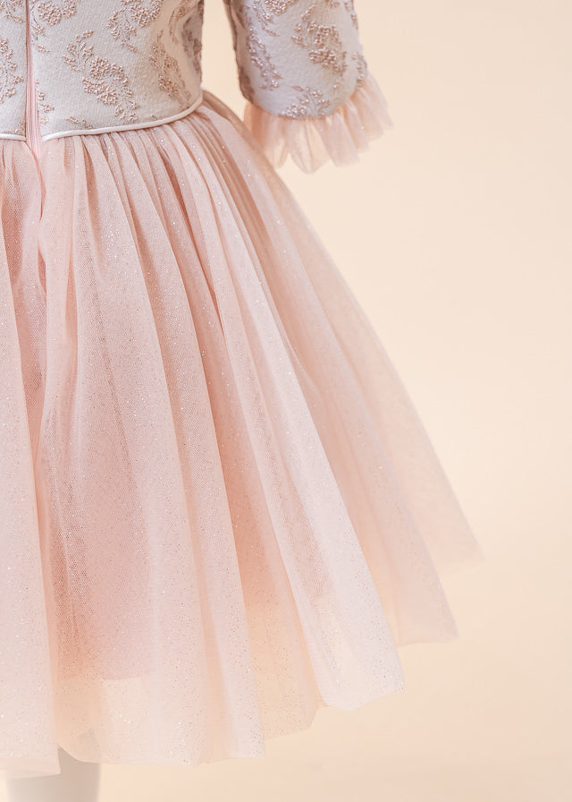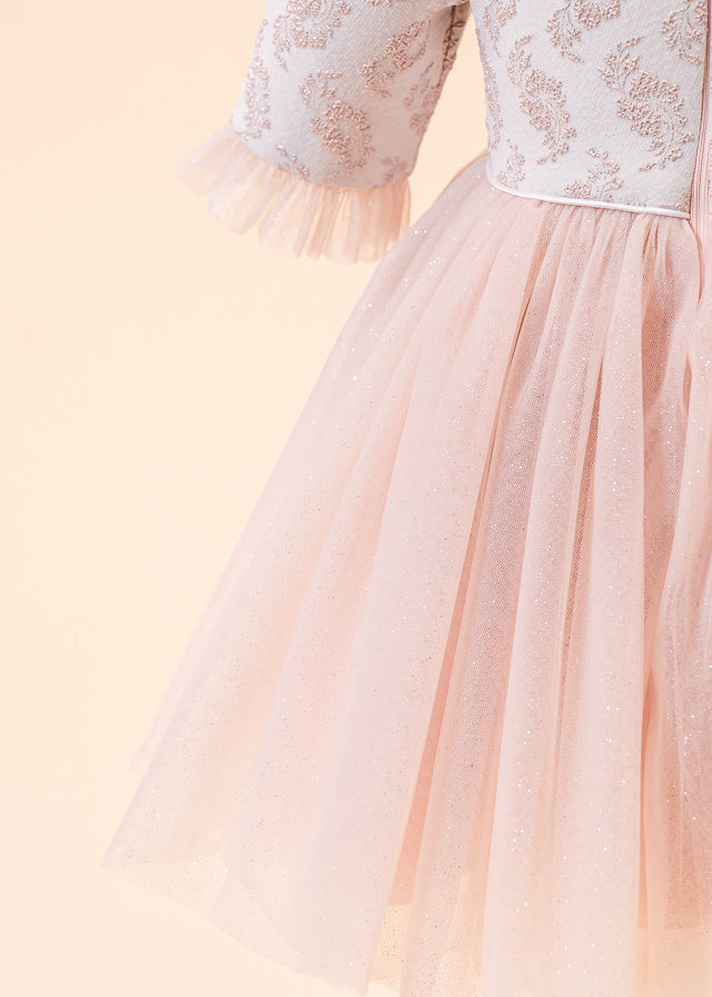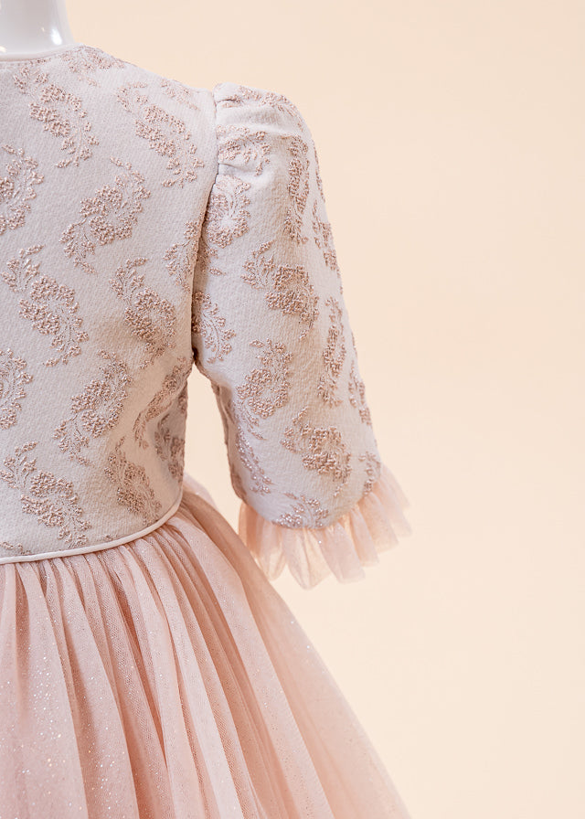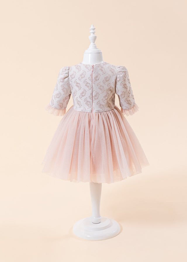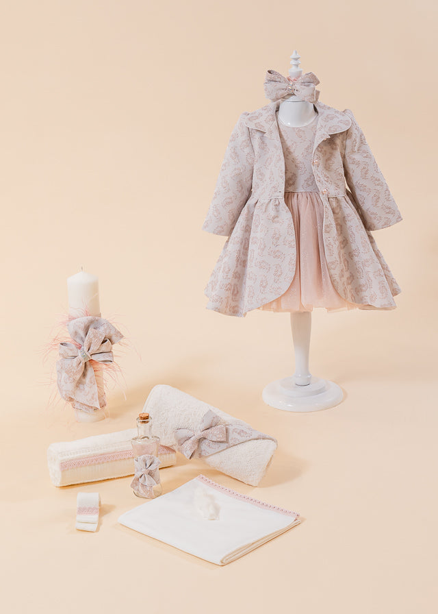 Setul Melania de la AnneBebe, compus dintr-o rochiță delicată și un pardesiu brocard roz, este alegerea perfectă pentru fetițele care participă la botez sau alte evenimente speciale. Designul elegant și materialele de calitate premium asigură un look sofisticat și un confort deosebit pentru micuța ta.