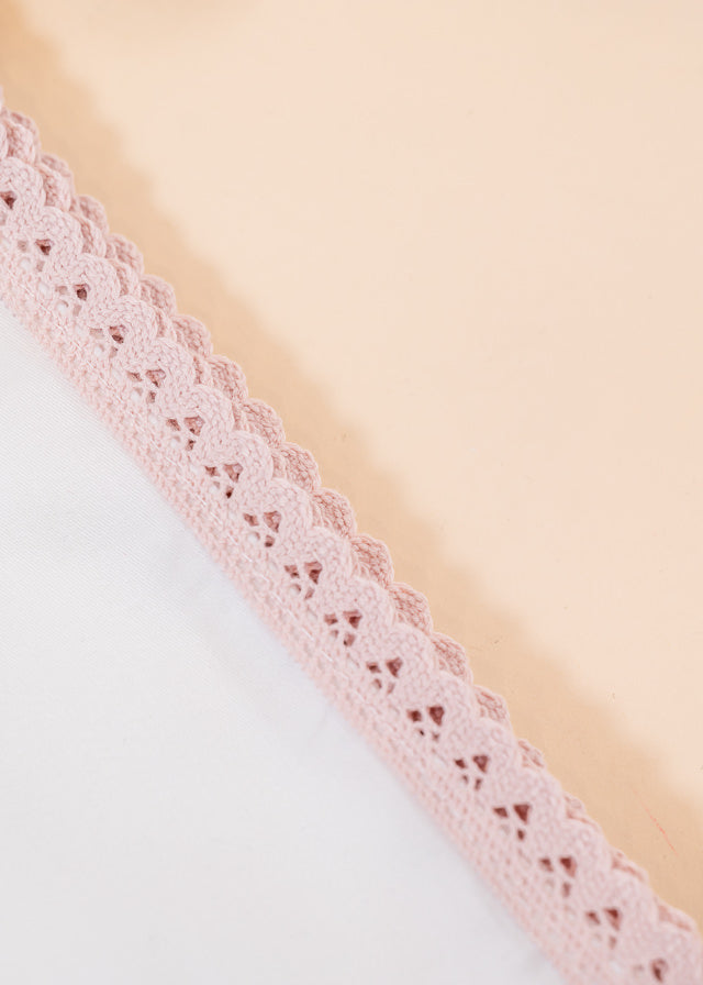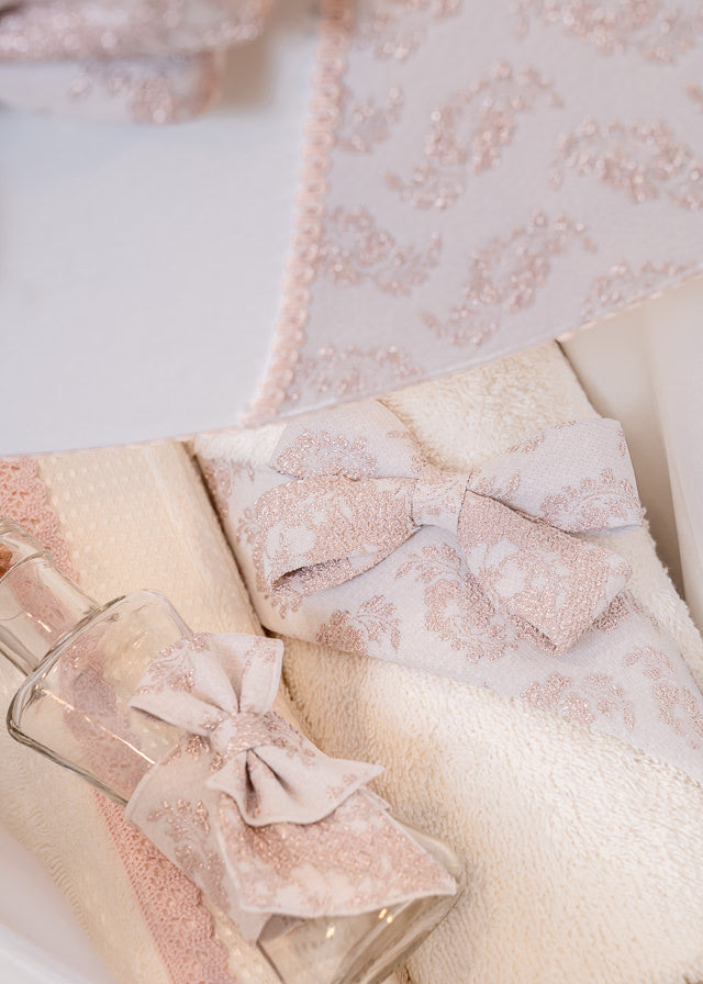 Design rafinat: Nuanțele crem și detaliile din fundița Brocard Roz adaugă un aer de eleganță și finețe, completând cu grație trusoul de botez.