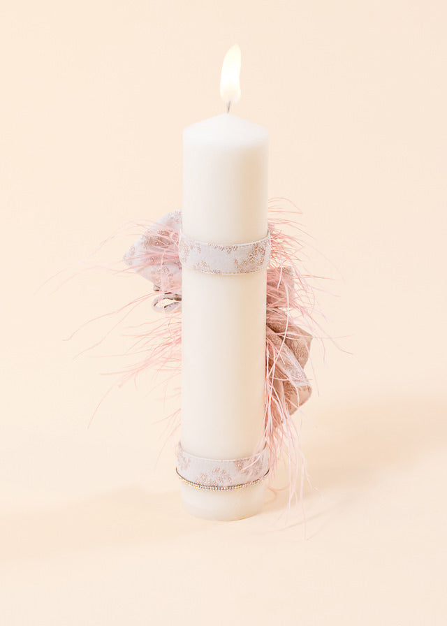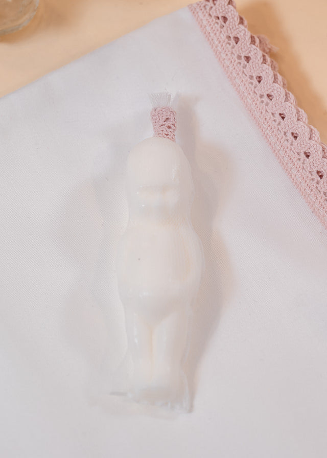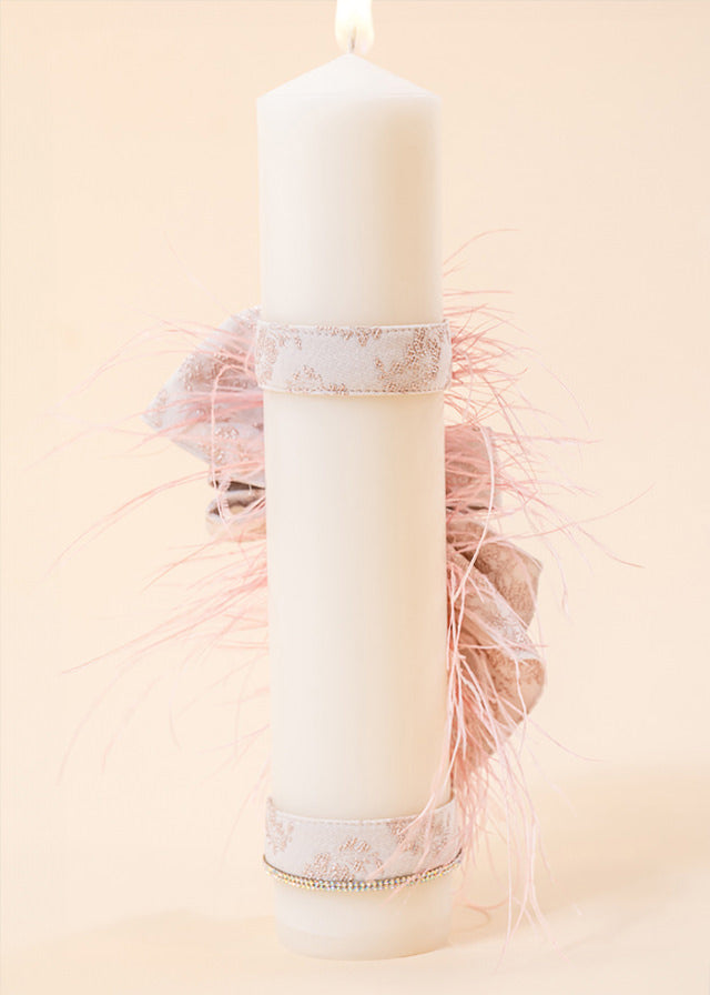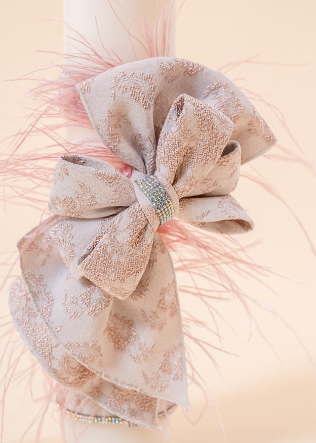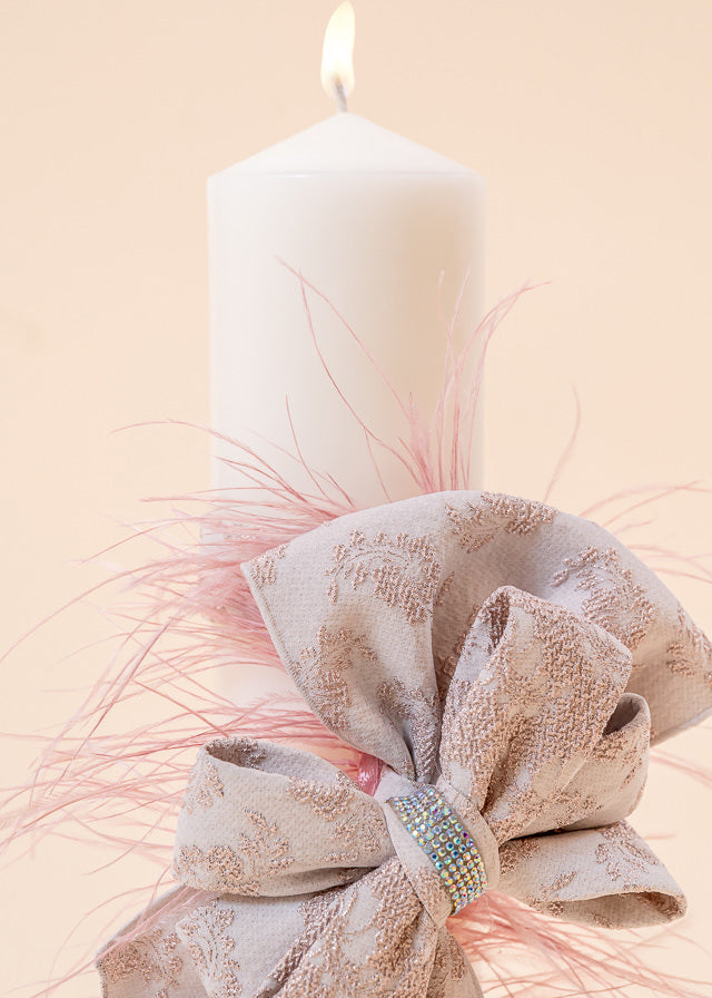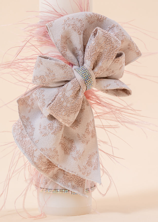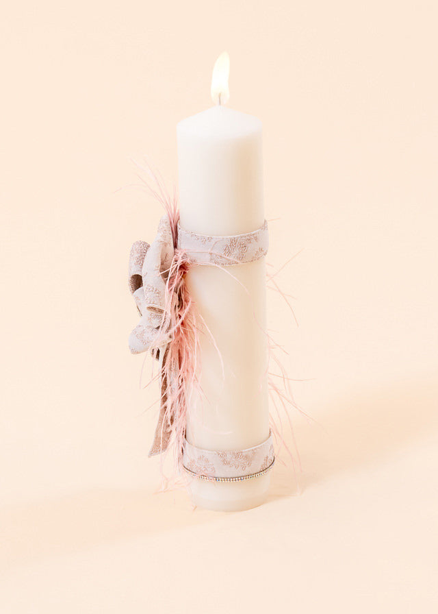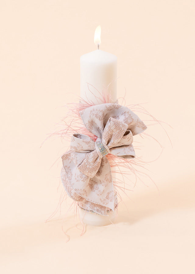 Această lumânare de botez, realizată cu pasiune în atelierele AnneBebe, îmbină rafinamentul cu delicatețea, aducând un plus de eleganță ceremoniei de botez. Nuanțele crem calde, îmbinate armonios cu fundița Brocard Roz, creează un ambient de poveste, perfect pentru a sărbători începutul unei vieți pline de speranță și iubire, fie că este vorba de băieței sau fetițe.