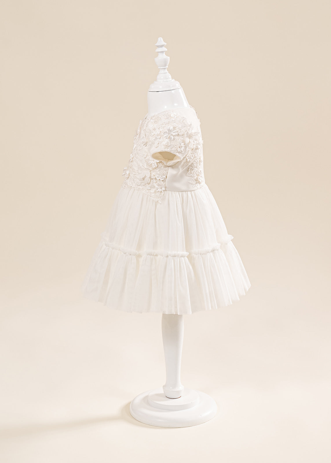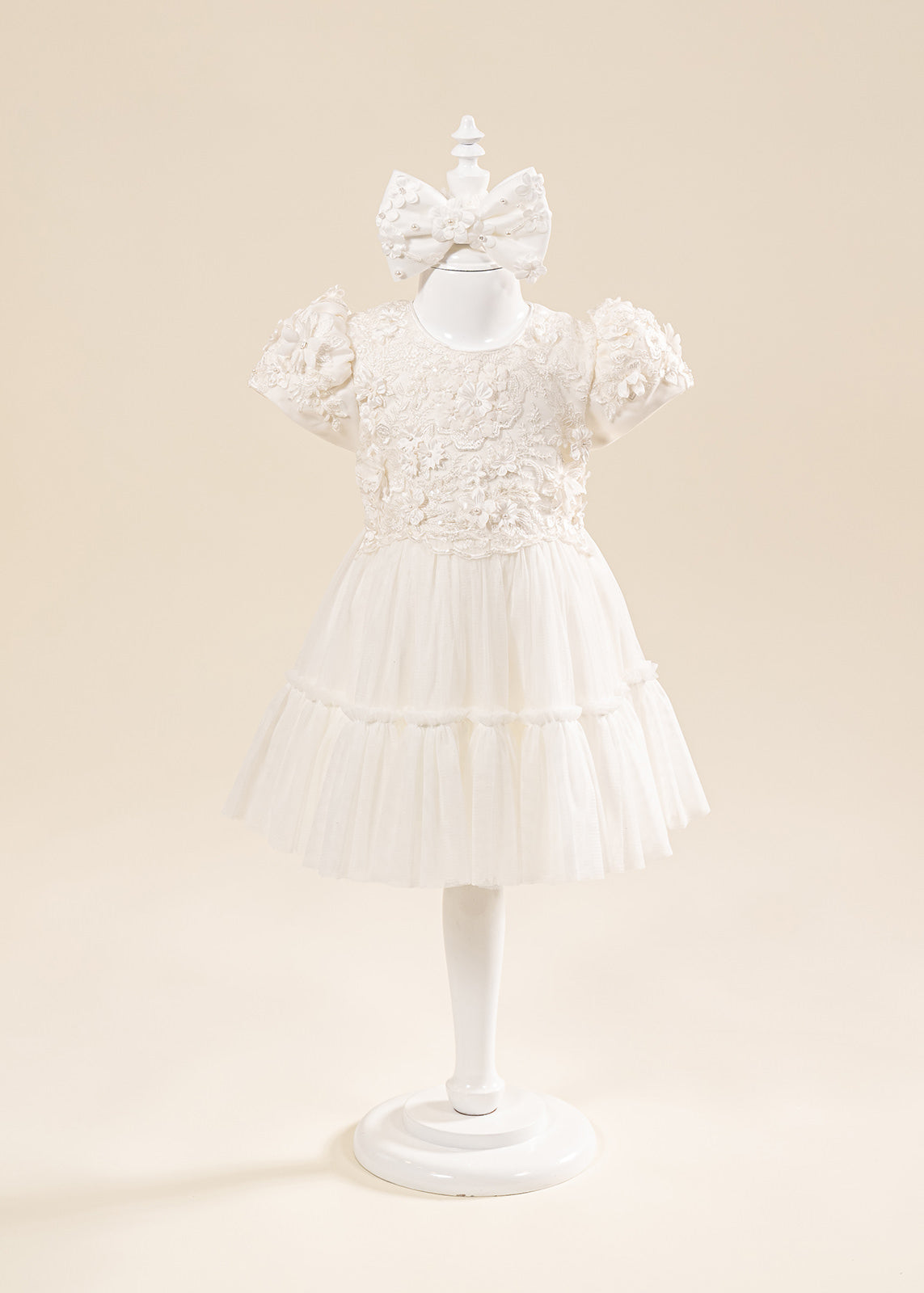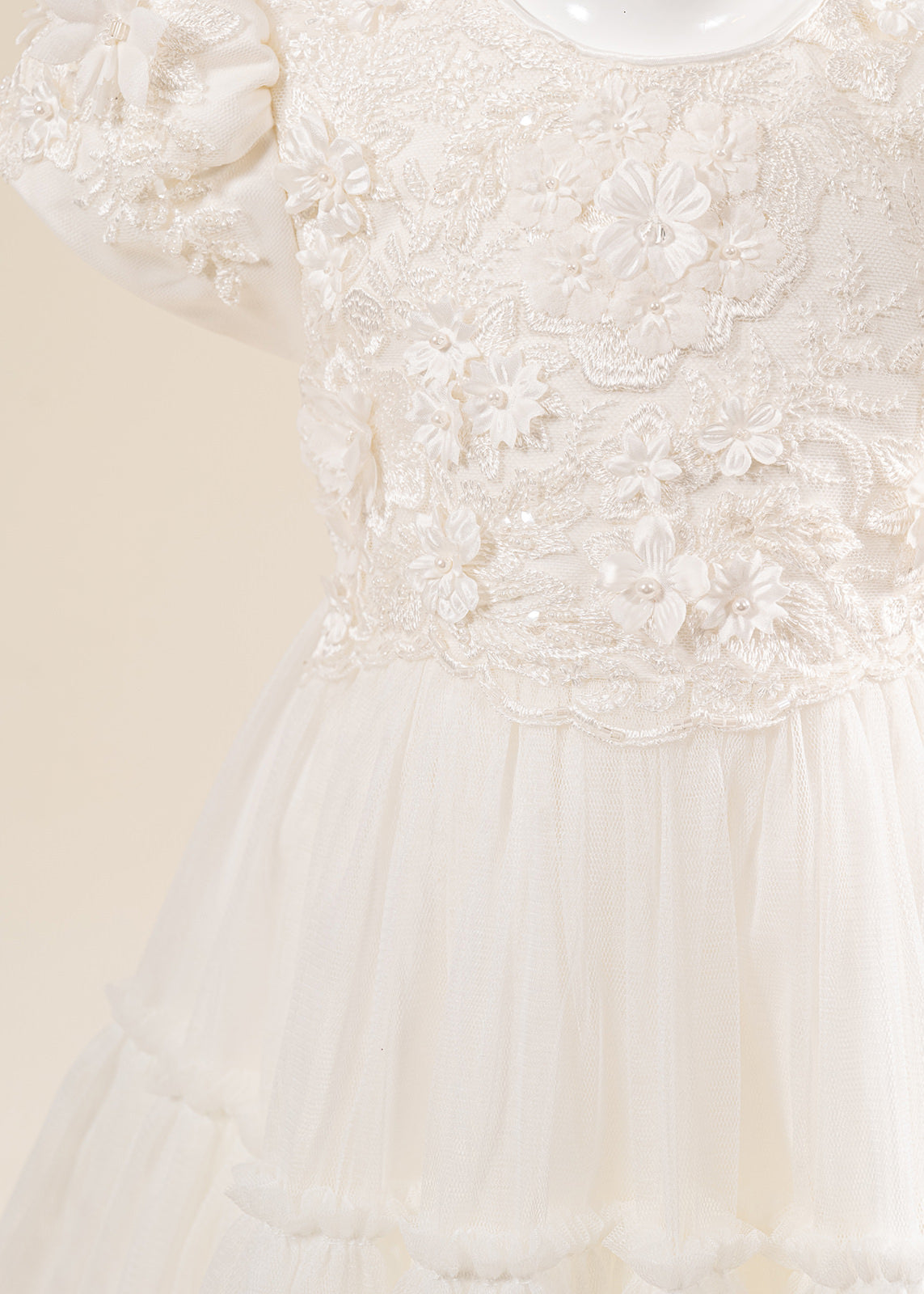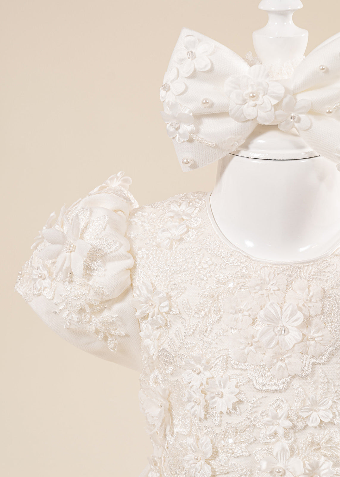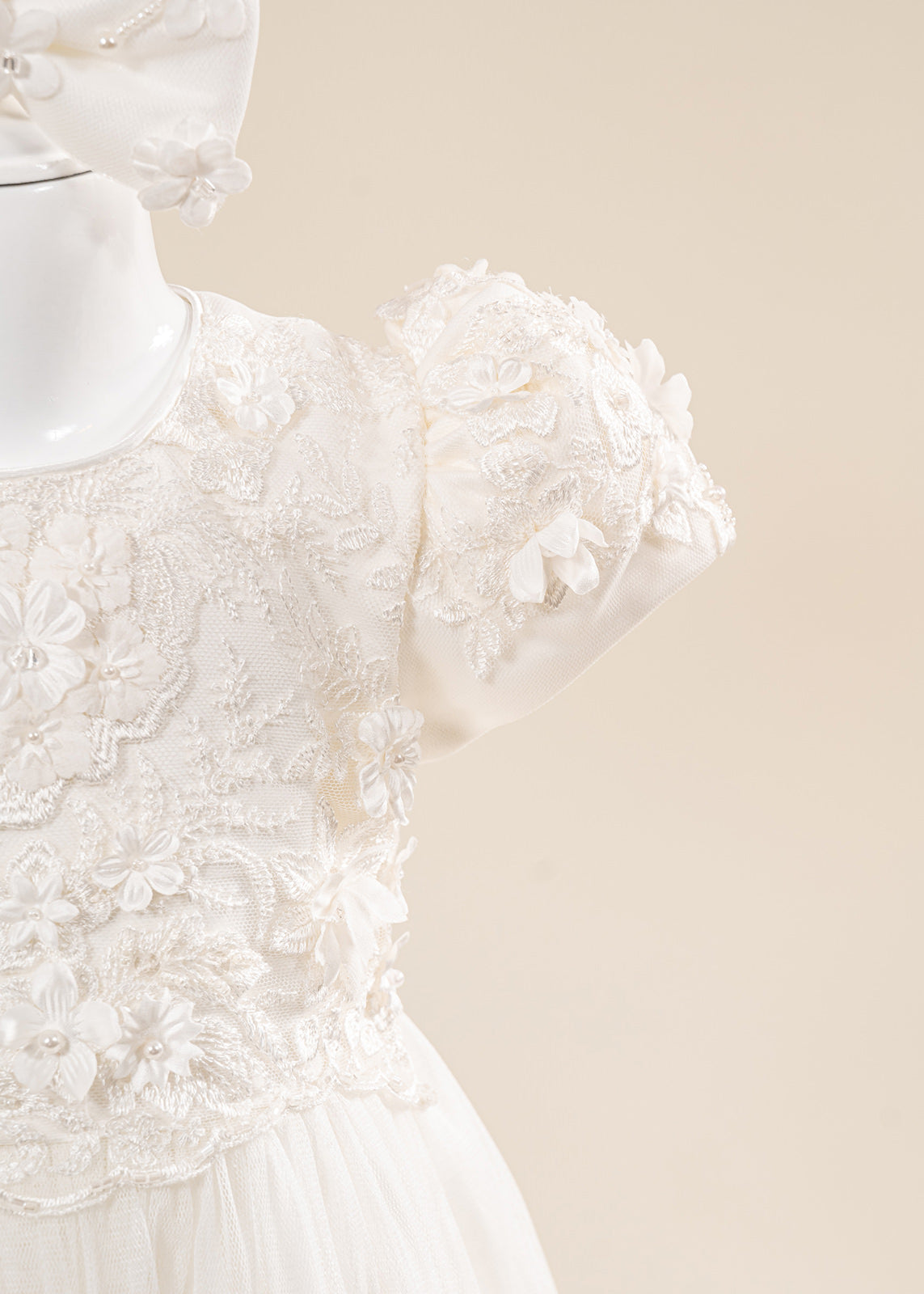 Design impresionant: Florile mari 3D realizate manual și nuanțele crem elegante oferă un aspect deosebit, potrivit în special pentru fetițe și ceremonii cu tematică clasică sau romantică.