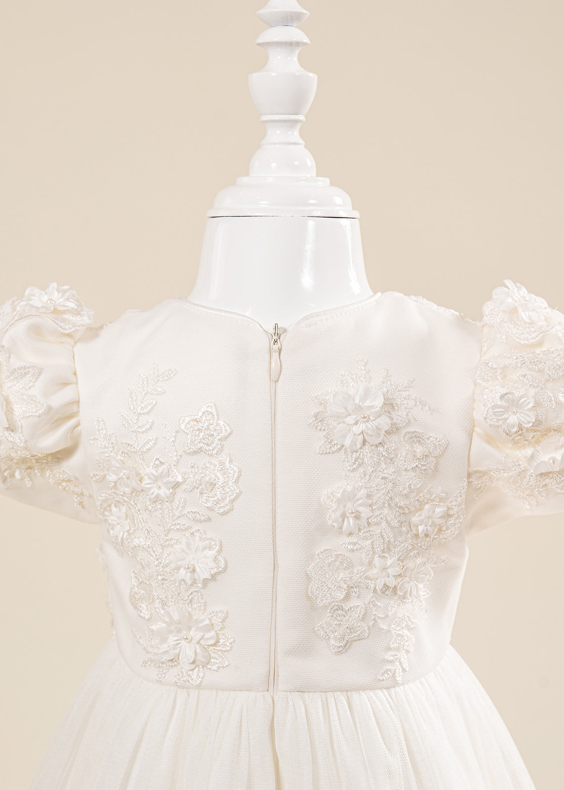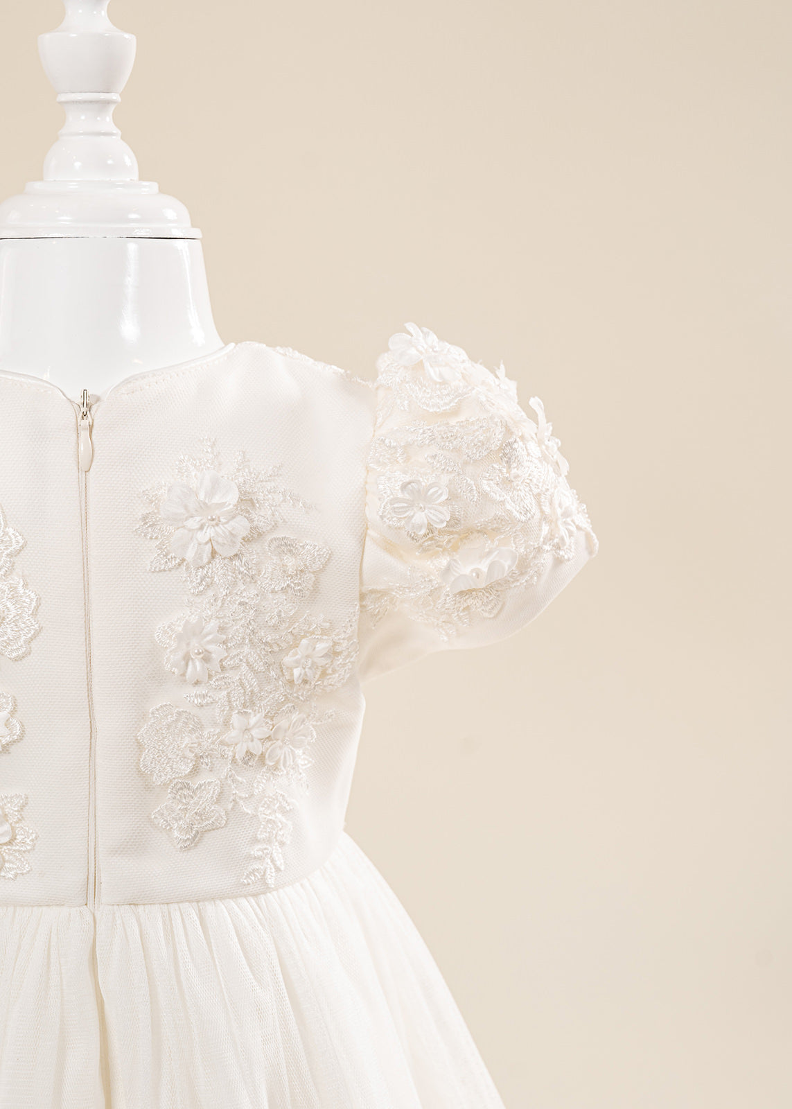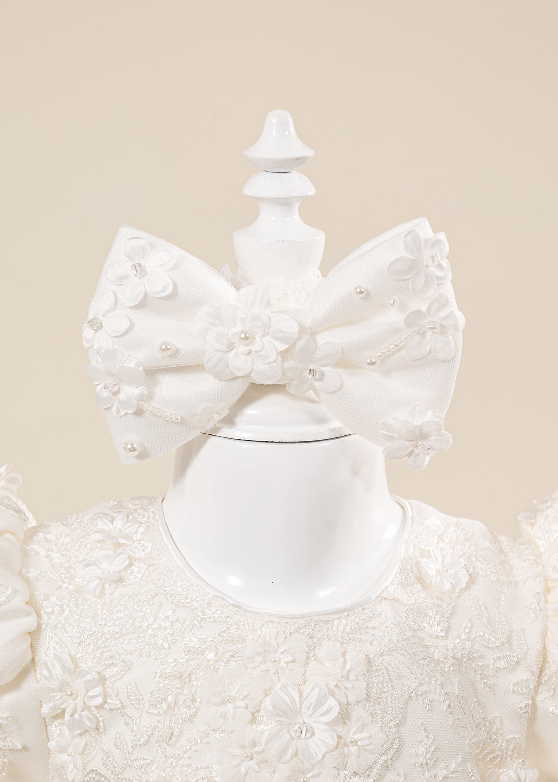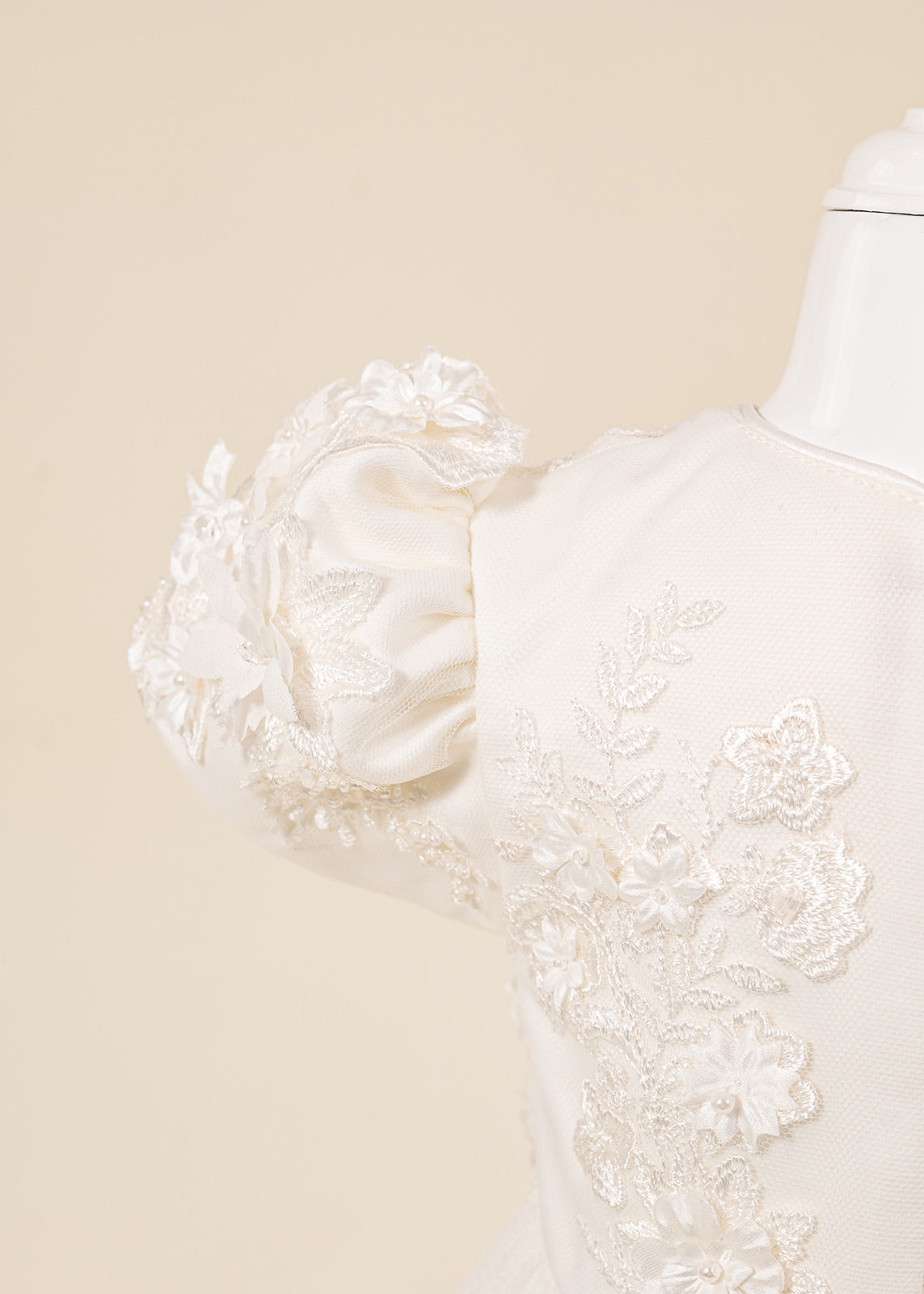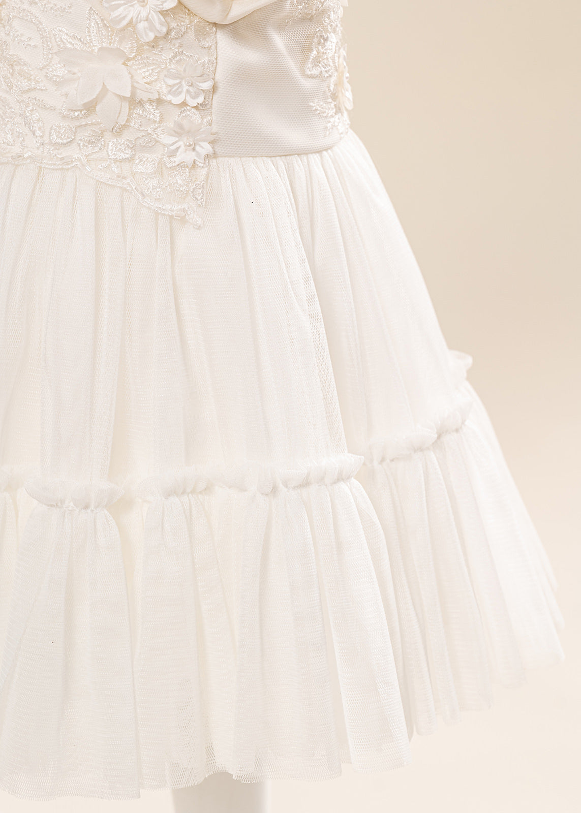 Design impresionant: Florile mari 3D realizate manual și nuanțele crem elegante oferă un aspect deosebit, potrivit în special pentru fetițe și ceremonii cu tematică clasică sau romantică.
