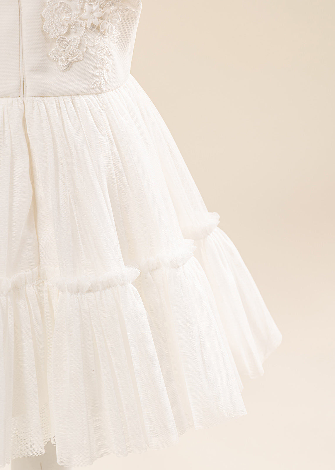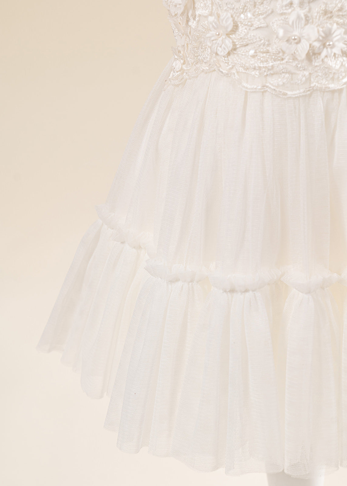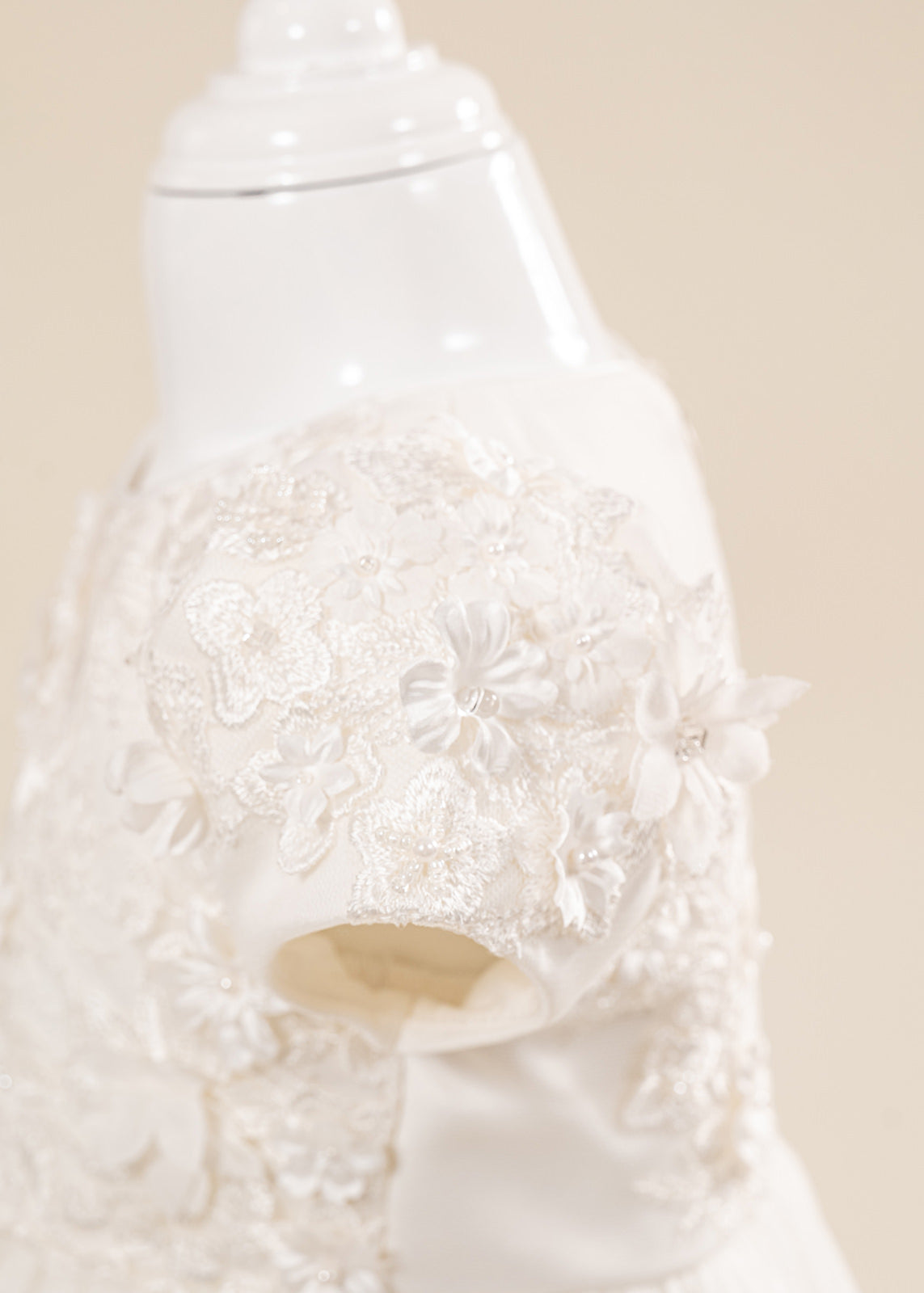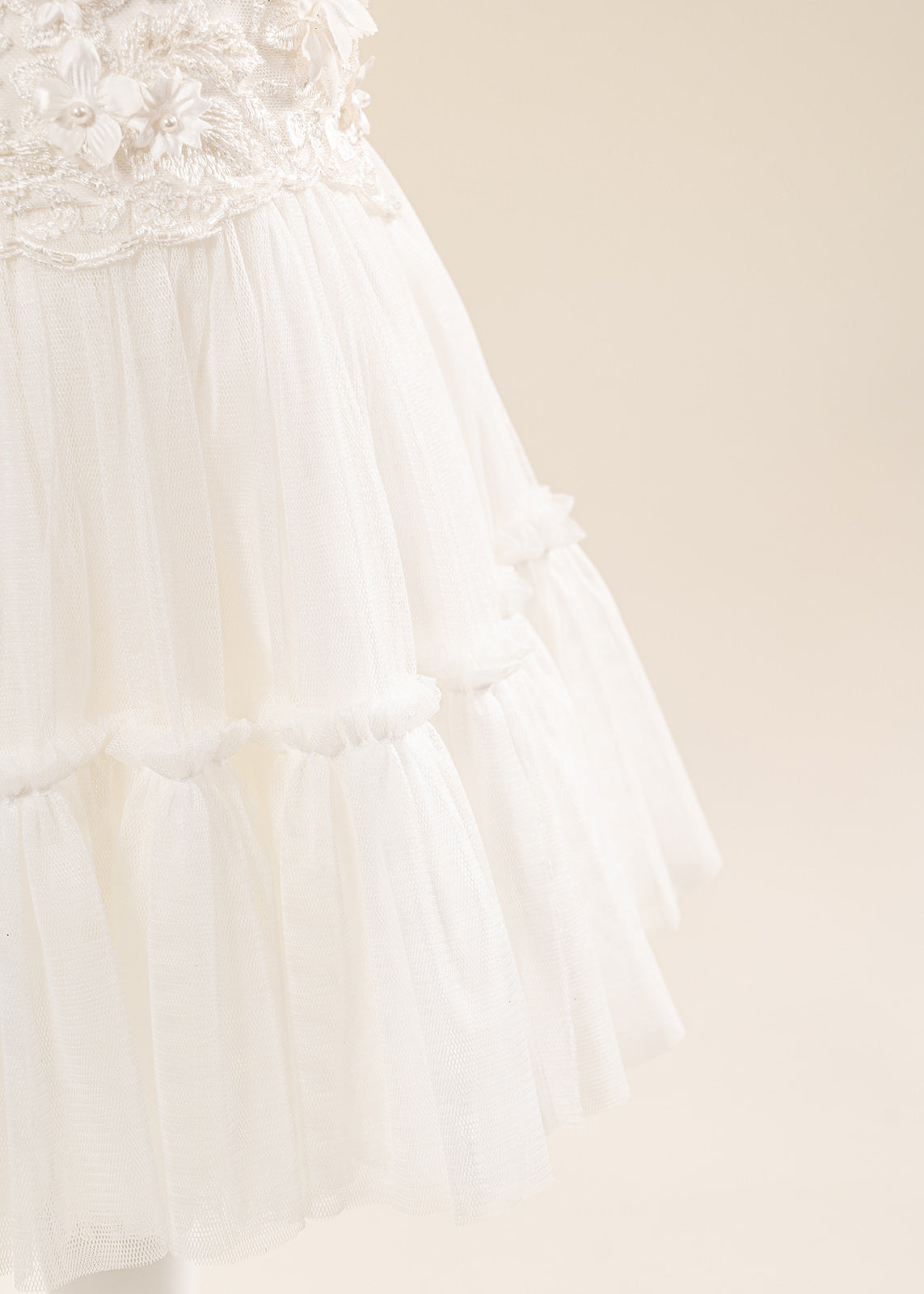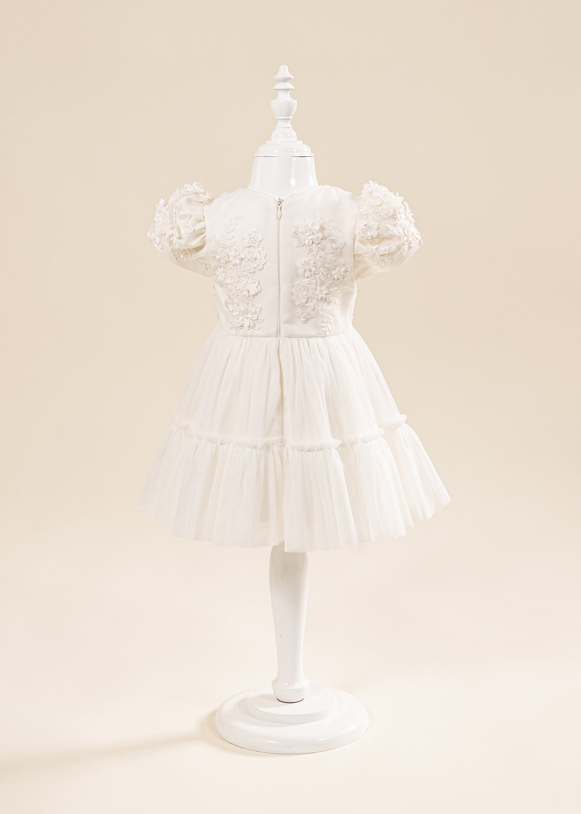 Design impresionant: Florile mari 3D realizate manual și nuanțele crem elegante oferă un aspect deosebit, potrivit în special pentru fetițe și ceremonii cu tematică clasică sau romantică.