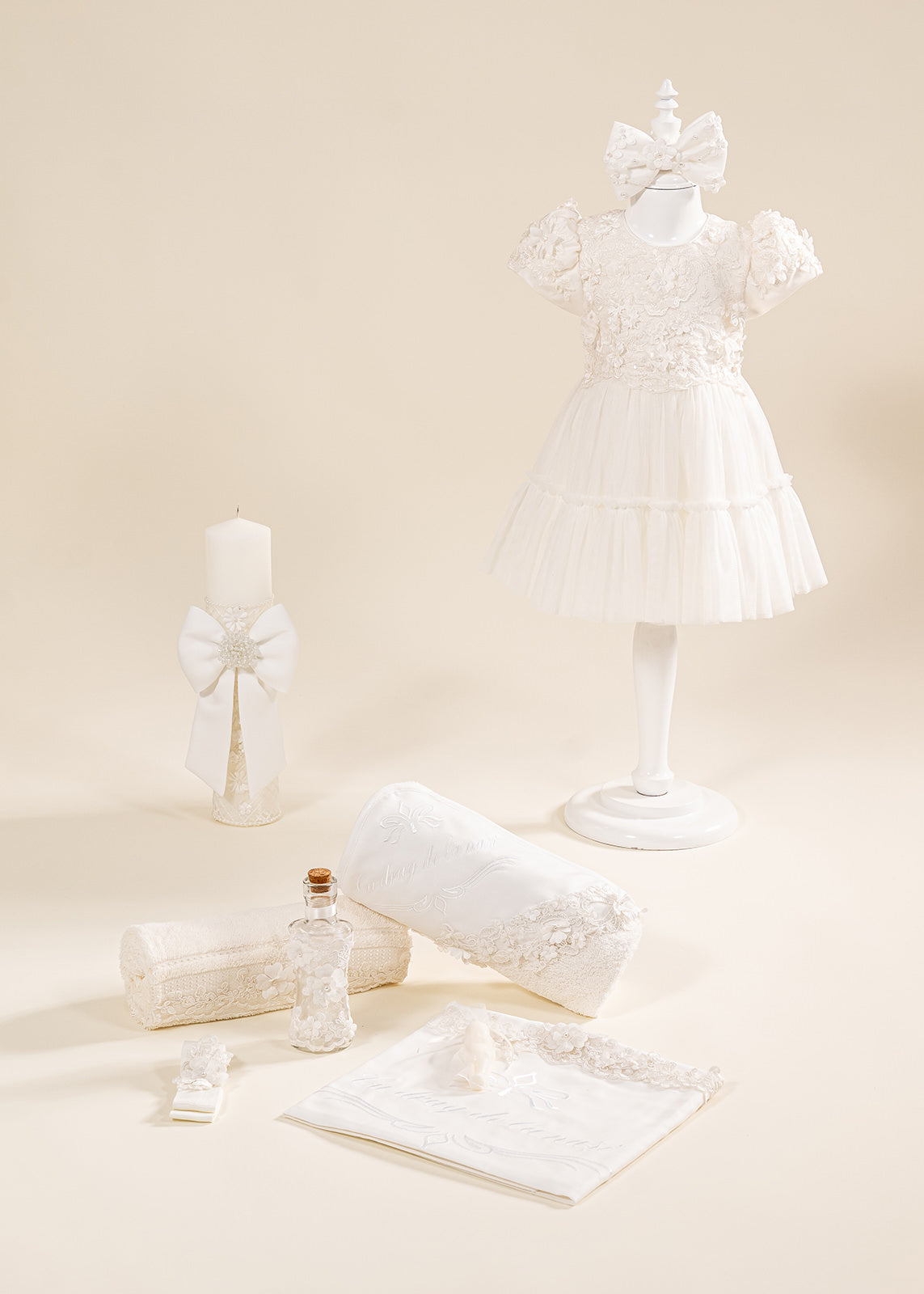 - Fașă de botez pentru mir: Cu dimensiuni de 100 cm x 3.5 cm, simbolizează puritatea și binecuvântarea oferită bebelușei în cadrul botezului.