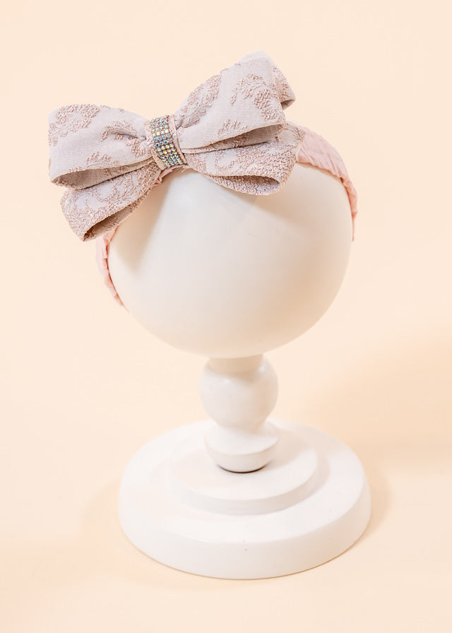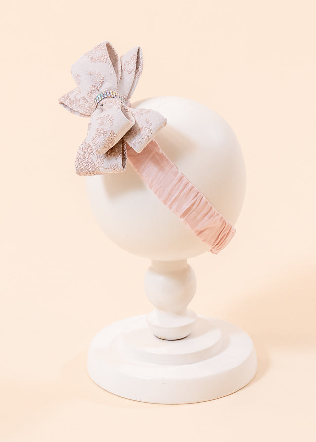 Bentita Melania de la AnneBebe este un accesoriu delicat și elegant, ideal pentru botezuri și evenimente speciale. Confecționată din brocard roz, această bentită completează perfect orice ținută festivă, oferind un plus de rafinament și stil micuței tale.