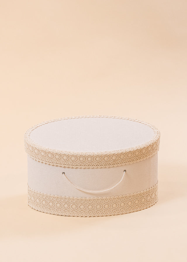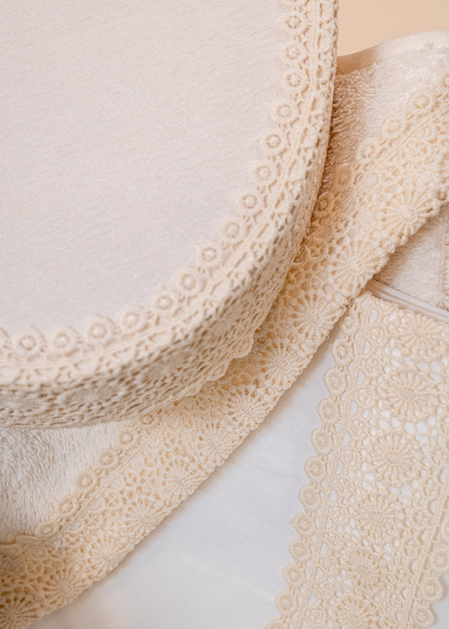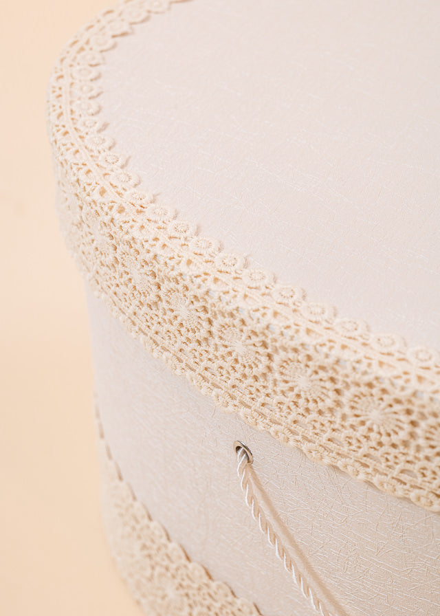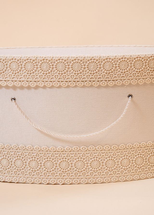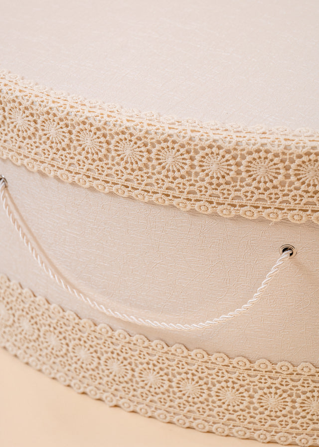 Fabricat manual cu o atenție deosebită la detalii, Cufarul Eva Oval Dantela Cappuccino Rozete impresionează prin exteriorul său delicat, decorat cu dantelă fină și rozete elegante, ce îi conferă o notă de rafinament și delicatețe. Designul oval al cufărului adaugă o notă de unicitate, fiind perfect pentru păstrat trusoul de botez, hăinuțele și accesoriile copilului. Banda de dantelă, de un delicat cappuccino, creează un contrast subtil și armonios, în timp ce detaliile fine completează perfect aspectul sofisticat.