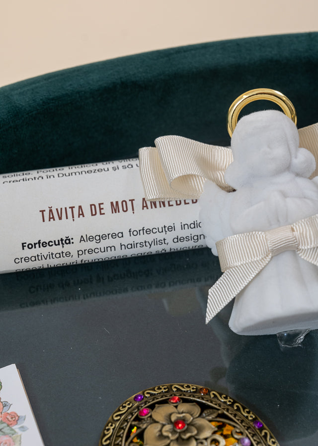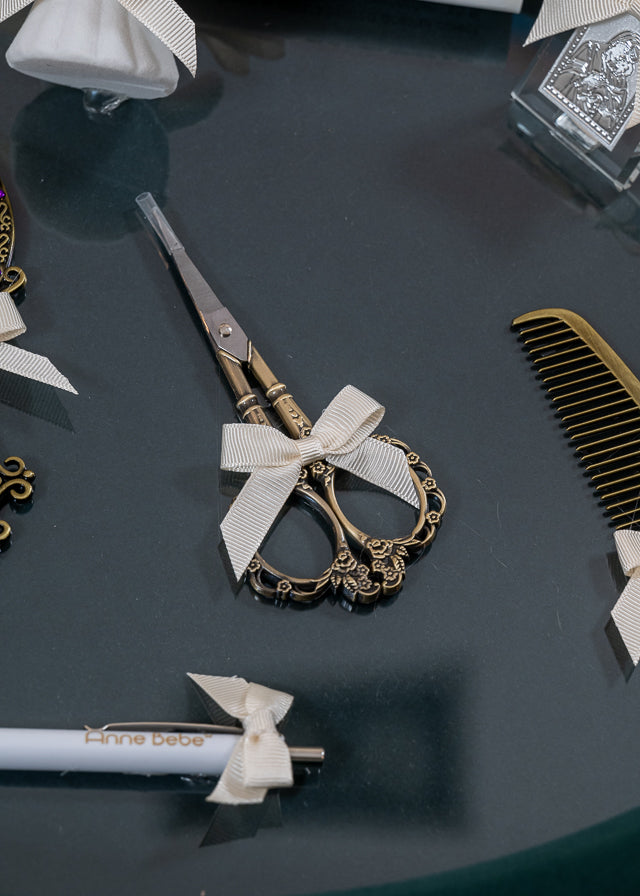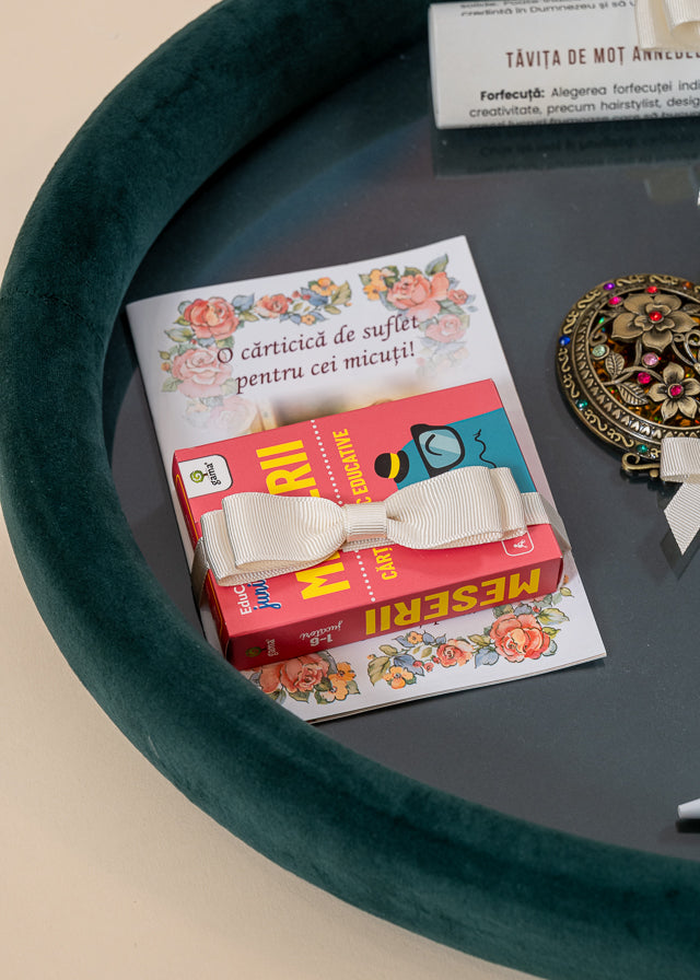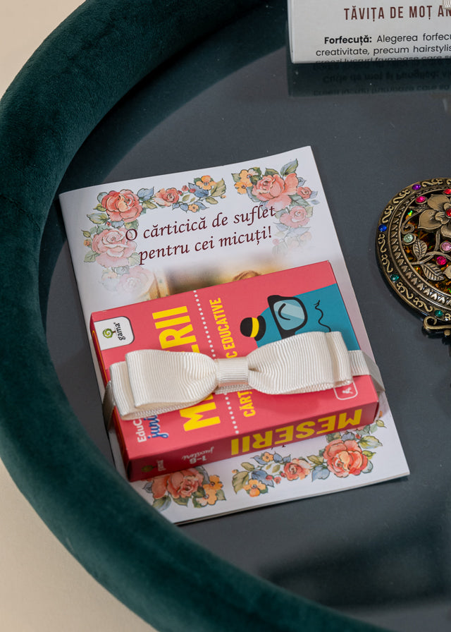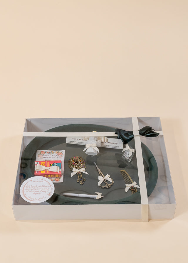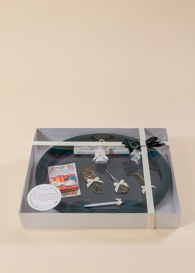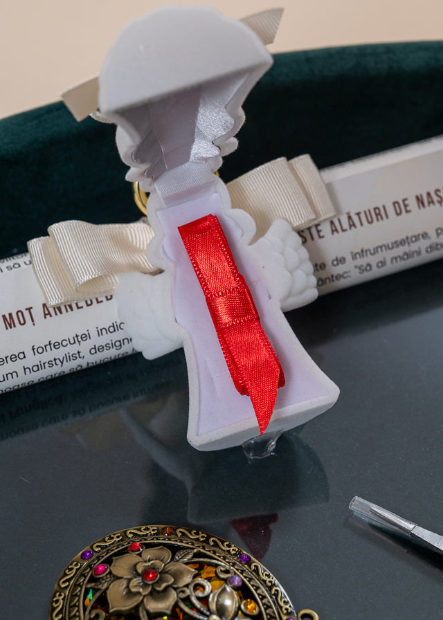 • Conținut Set: Pieptăn, foarfecă, oglindă, cutie pentru șuviță în formă de înger, bandă satinată, joc de meserii, carte de rugăciuni, pix alb, iconiță, tăviță de moț, ghid pentru tradiții, cutie transparentă și fundă pentru cadou.