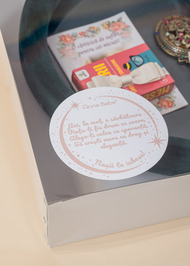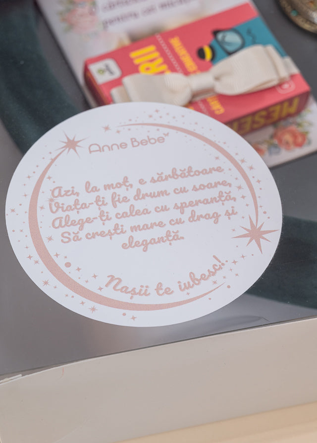 • Ghid Complet și Ambalaj Cadou: Setul vine completat cu un ghid detaliat despre tradițiile legate de tăierea moțului și ruperea turtei (pentru fete), toate ambalate într-o cutie transparentă elegantă, legată cu o fundă pentru un aspect deosebit.