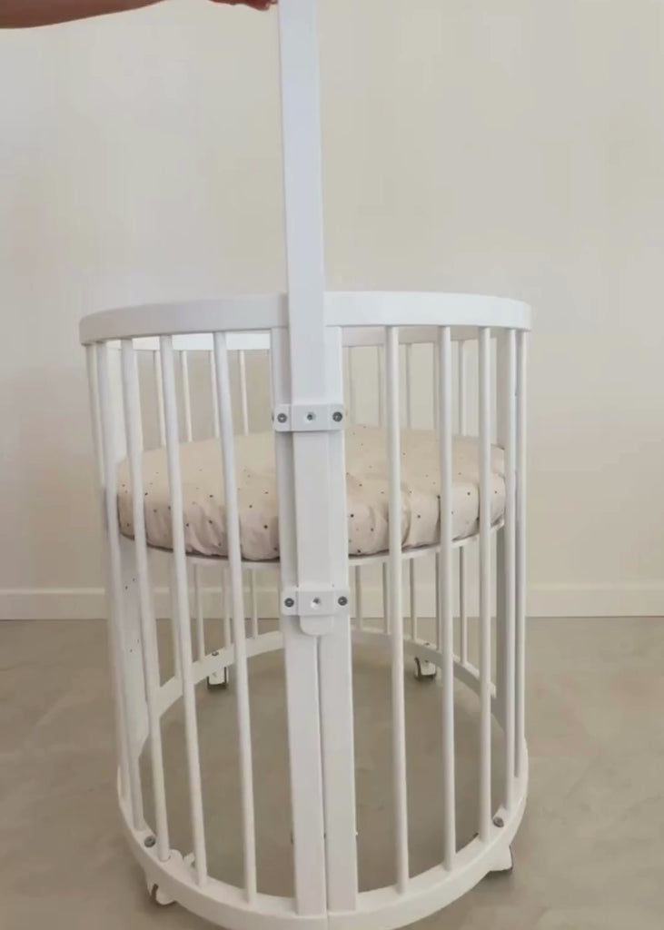 Mai mult decât un simplu accesoriu, acest suport din lemn alb este soluția completă pentru părinții care doresc să îmbine eleganța cu funcționalitatea. Creat special pentru pătuțurile transformabile 9 în 1 și alte modele cu îmbinări prin șuruburi, suportul se fixează în zona de îmbinare, acolo unde trece șurubul de prindere – asigurând o stabilitate excelentă.