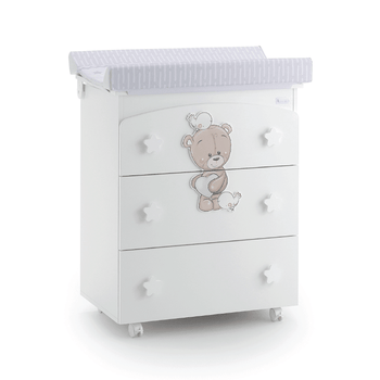 Comoda Bebelusi Love Me vine in ajutor cu o masuta speciala de infasat si o cadita ergonomica pentru bebelusi cu varsta cuprinsa intre 0 si 6 luni. Dupa aceasta perioada se pot detasa atat masuta cat si cadita pentru a ramane o piesa de mobilier practica si moderna. Comoda are 4 roti, 2 prevazute cu blocatori si 3 sertare spatioase extrem de utile pentru Pampersi, creme, servetele si hainutele bebelusului.