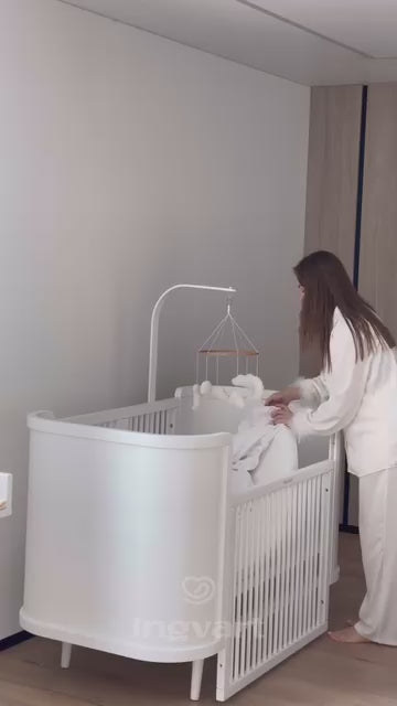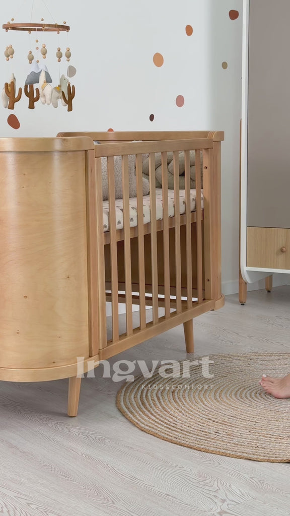 With a versatile and adaptable design, the crib is convertible into a mini bed for newborns, a standard crib, a playpen or a stylish sofa for the child's room. The 5-level adjustable base allows easy adaptation according to the child's developmental stage, providing comfort for parents and safety for little ones. The removable sides ensure an easy transition from crib to play space or accessible resting place. This crib is the ideal choice for parents looking for a complete product – elegant, safe, natural and durable – built to accompany their child in the first essential years of life.
