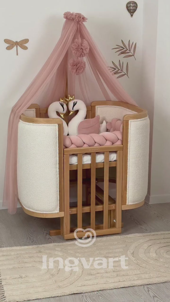 1. Classic crib (0–3 years) 70 x 134 cm – With oval sides and padded velour ends, it offers a soft, safe and elegant space.