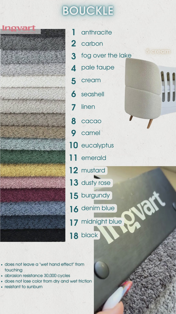 The Boho Chesterfield Milky cot is made of solid alder wood, a natural, durable and environmentally friendly material, sourced from sustainable sources and FSC certified. All components are treated with non-toxic water-based paints , completely safe for little ones, including in the event of direct contact or chewing – a frequent concern for parents. The design of this cot complies with the strict safety standards EN 716-1/2 , providing a safe space, tested and certified according to European norms. The rounded edges, without hard corners, help eliminate the risk of injury, while the hand-padded upholstery in soft velour adds an extra touch of refinement and protection.